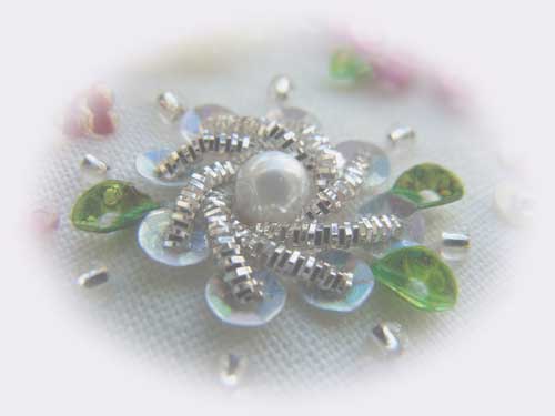 はじめは、円形の連続刺し(ビーズを立体的に刺していく)から。これだけでも組み合わせでとってもかわいいですよね。